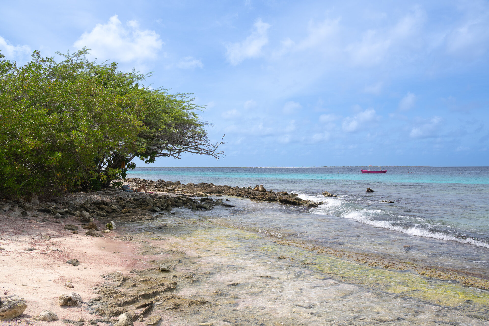 Andrea I ligt aan de westkust van Bonaire, net ten zuiden van Andrea II. De parkeerplaats is klein, dus het is slim om je auto tactisch te parkeren. Vanaf daar wandel je ongeveer 20 meter door de bosjes naar de entree/exit, die verrassend makkelijk te gebruiken is. Je stapt het water in tussen een paar koraalrotsen en zwemt over een ondiep zand en koraalplateau. Het rif begint al op een paar meter diepte en loopt langzaam af tot ongeveer 25 tot 30 meter. Het kleurrijke koraal biedt een thuis aan tropische vissen, papegaaivissen en soms een nieuwsgierige schildpad.